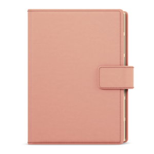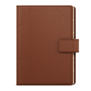 jemný matný materiál, ražba, oboustranná pěnová výplň desek, obšití v barvě potahu, magnetická přezka, poutko na tužku, 3 vnitřní kapsy, šitá vazba V8, kapitálky, stužka, perforované rožky, papírová manžeta
