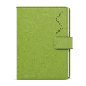 jemný hladký materiál s lesklým povrchem, ražba, oboustranná pěnová výplň desek, obšití v barvě potahu, magnetická přezka, poutko na tužku, 3 vnitřní kapsy, šitá vazba V8, kapitálky, stužka, perforované rožky, ručně vyráběné desky + papírová manžeta, ofse