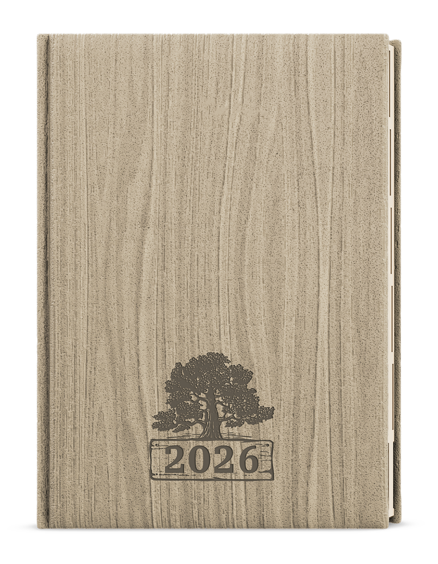 Originální denní diář s přírodním motivem dřeva a ražbou je vyráběný z jemně strukturovaného materiálu s efektním výsekem uvnitř. Má velký prostor pro poznámky a plánování. Výjimečností tohoto diáře je, že soboty i neděle jsou na každé stránce zvlášť.