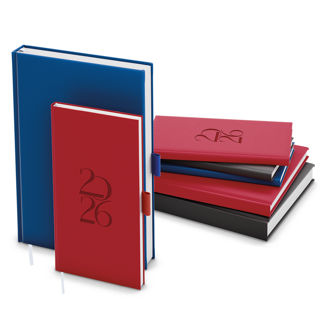 jemně strukturovaný materiál, ražba roku, jednostranná pěnová výplň desek, šitá vazba V8, stužka, perforované rožky, mapa ČR a SR, vlepená kapsa, poutko v barvě, ofset, 70g/m2