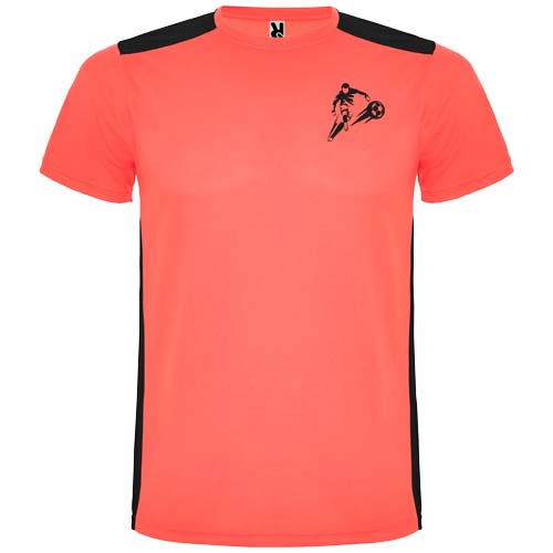 Snadno schnoucí, technická a prodyšná látka. Kulatý výstřih. Kombinace dvou polyesterových látek na zádech a ramenou. Látka „ptačí oko“ vpředu a prodyšná 3D síťovina na zádech. Látka připravená pro absorpci vlhkosti. Ozdobný klikatý zadní steh na bocích a na ramenou. Zadní vzor je mírně delší. Odnímatelný štítek.