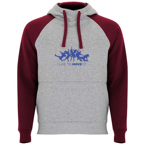 Dvoubarevná unisex mikina s kapucí. Kapuce se zkříženým límcem a kovovými očky. Kontrastní vnitřní kapuce, stahovací šňůrka a raglánové rukávy. Klokaní kapsa. Manžety a lem z elastanového žebrového úpletu 1 × 1. Odnímatelný štítek.