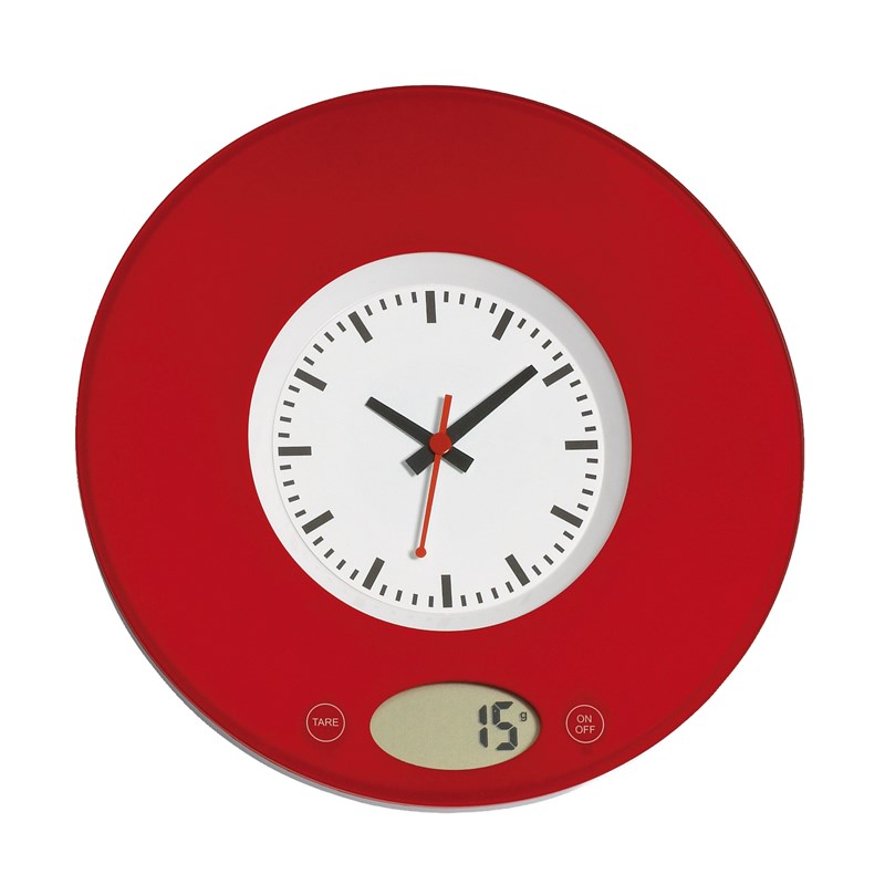 Digitální kuchyňská váha se skleněným povrchem a dotykovými panely, zobrazuje hmotnost v kg, g, oz a lbs (lze nastavit na zadní straně), analogové hodiny, váží max. 3 kg, držák na stěnu, z plastu a skla.