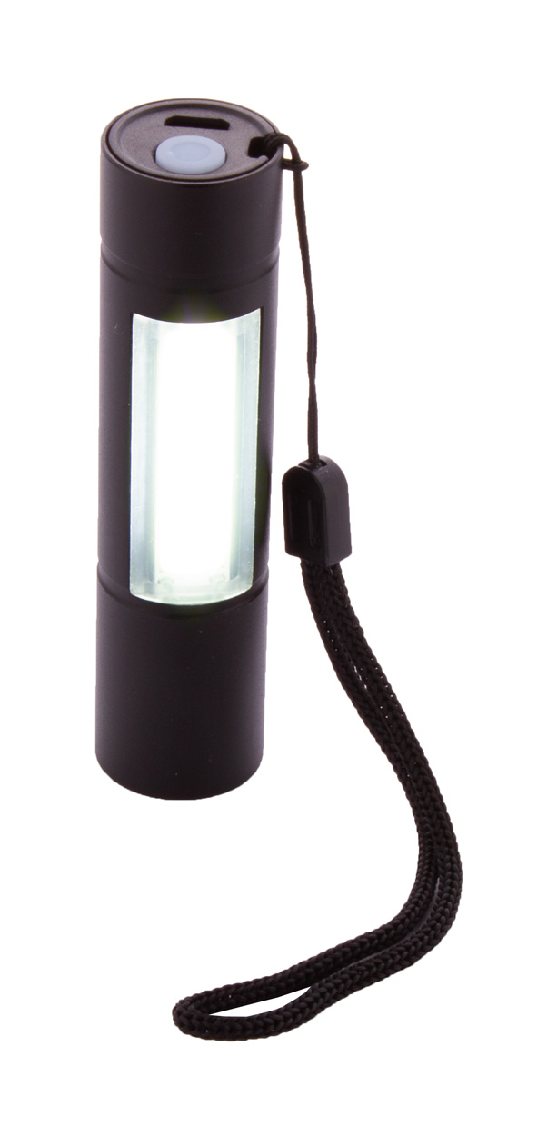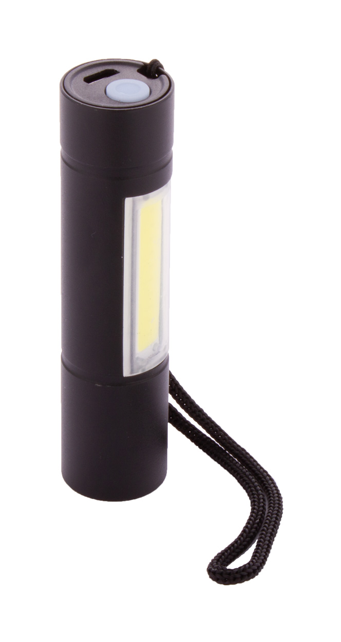 Hliníková baterka s vestavěnou USB dobíjecí baterií a popruhem na přenášení. S vysoce výkonným LED světlem na písmu a COB světlem na boku. Včetně USB nabíjecího kabelu.