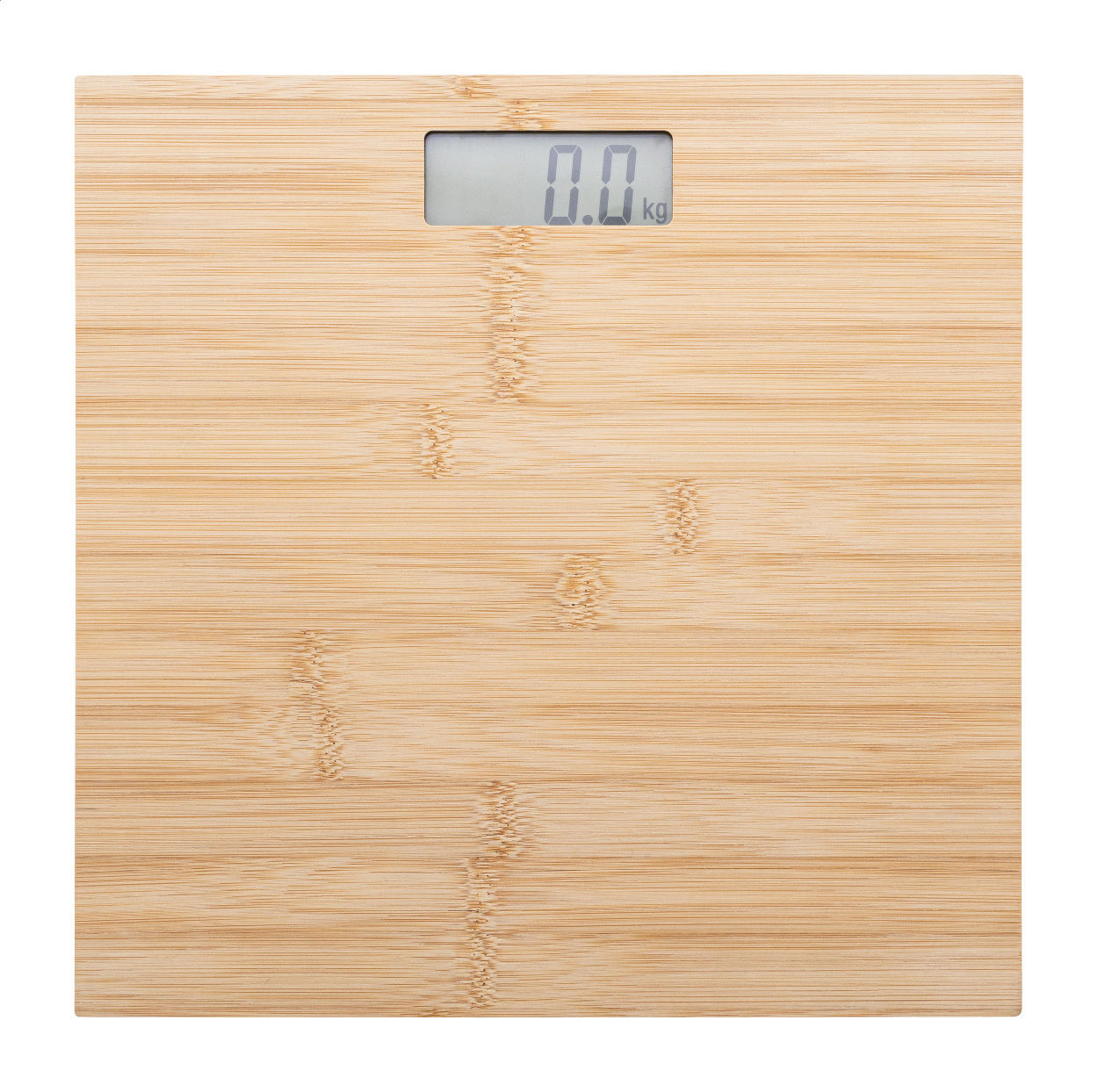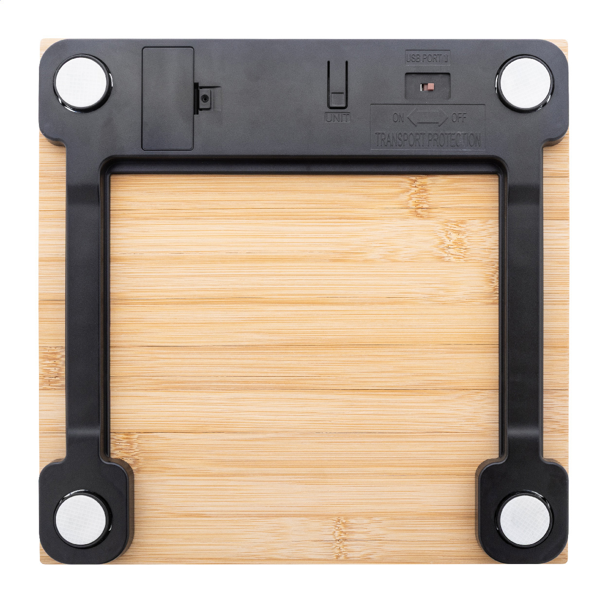 Digitální koupelnová váha s bambusovou vážicí plošinou. Vážení: 150 kg, stupnice 0,1 kg, měrné jednotky: kg/lb/st. S vestavěnou dobíjecí baterií. Včetně USB nabíjecího kabelu.