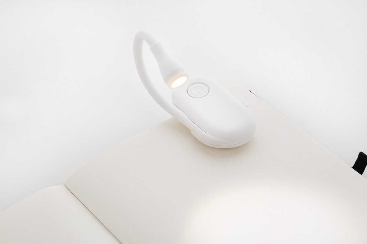 Klipová lampička na čtení z ABS s flexibilní LED lampou a vestavěnou USB dobíjecí baterií (220 mAh). S režimy teplého, přirozeného a studeného světla. Včetně USB nabíjecího kabelu.