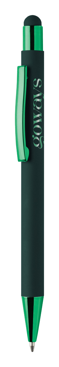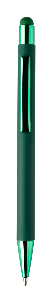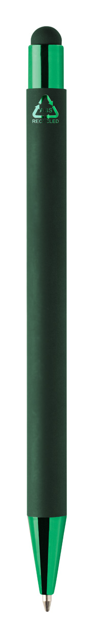Recyklované hliníkové kuličkové a dotykové pero s pogumovaným tělem a barevnými lesklými kovovými částmi. Se speciální vrstvou pro zrcadlové gravírování odpovídající kovovým částem. S modrou náplní.