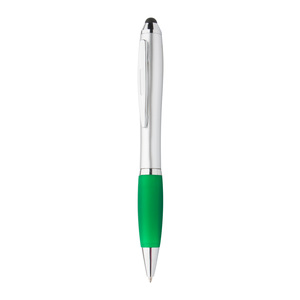 Plastové kuličkové pero pro dotykový displej se stříbrným tělem a barevným gumovým gripem. Dodává se s modrou náplní.
