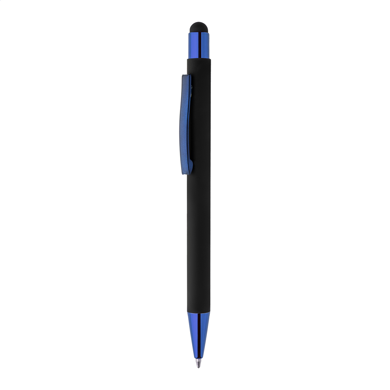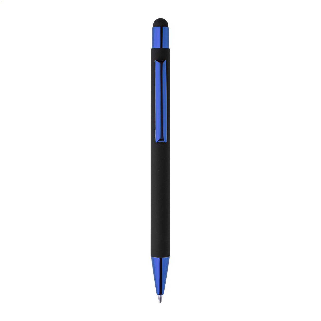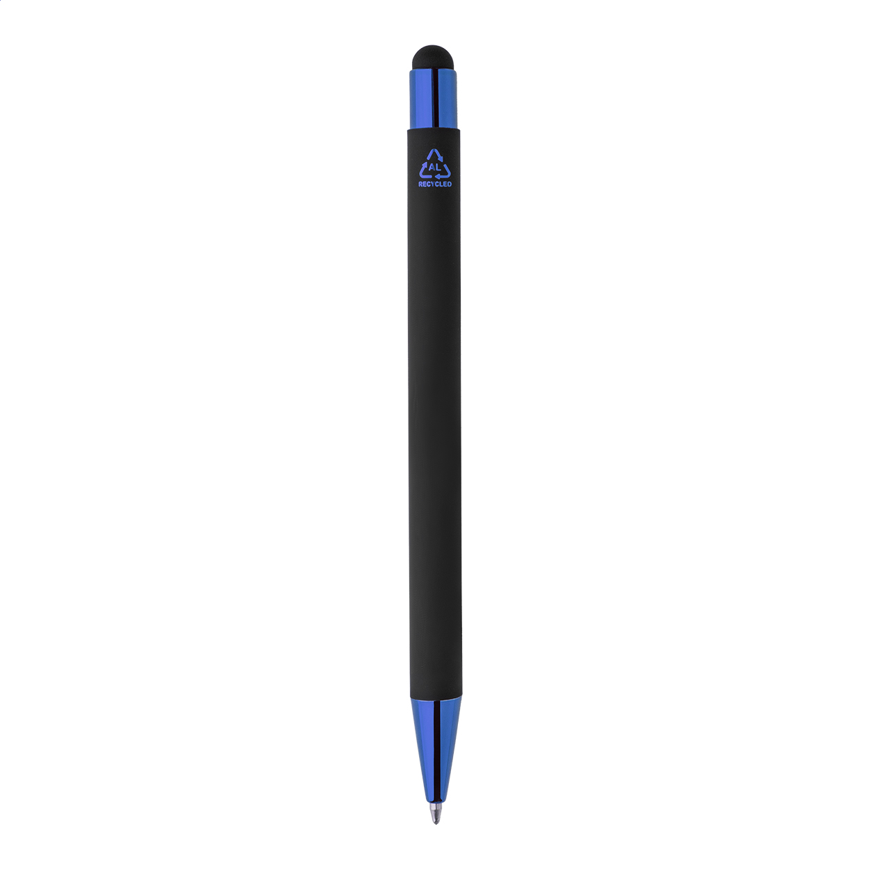 Kuličkové pero z recyklovaného hliníku na dotykovou obrazovku, s černým pogumovaným tělem a barevnými lesklými kovovými částmi. Se speciálním povrchem pro zrcadlové gravírování, které ladí s kovovými částmi. S modrou náplní.