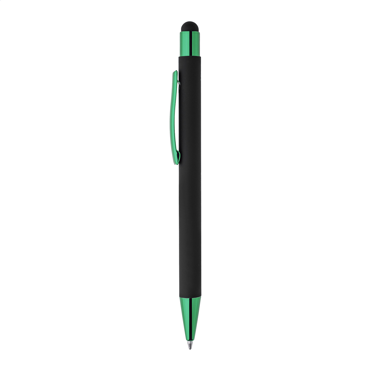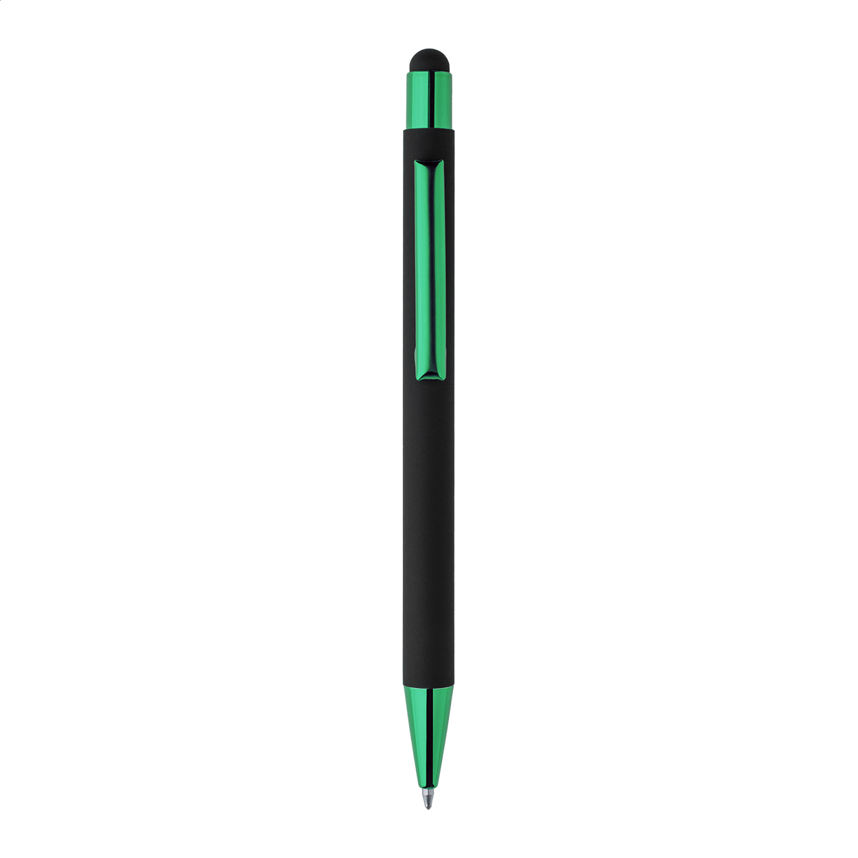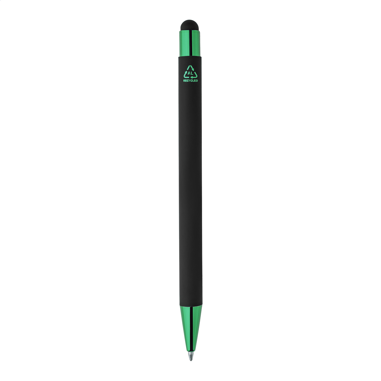 Kuličkové pero z recyklovaného hliníku na dotykovou obrazovku, s černým pogumovaným tělem a barevnými lesklými kovovými částmi. Se speciálním povrchem pro zrcadlové gravírování, které ladí s kovovými částmi. S modrou náplní.
