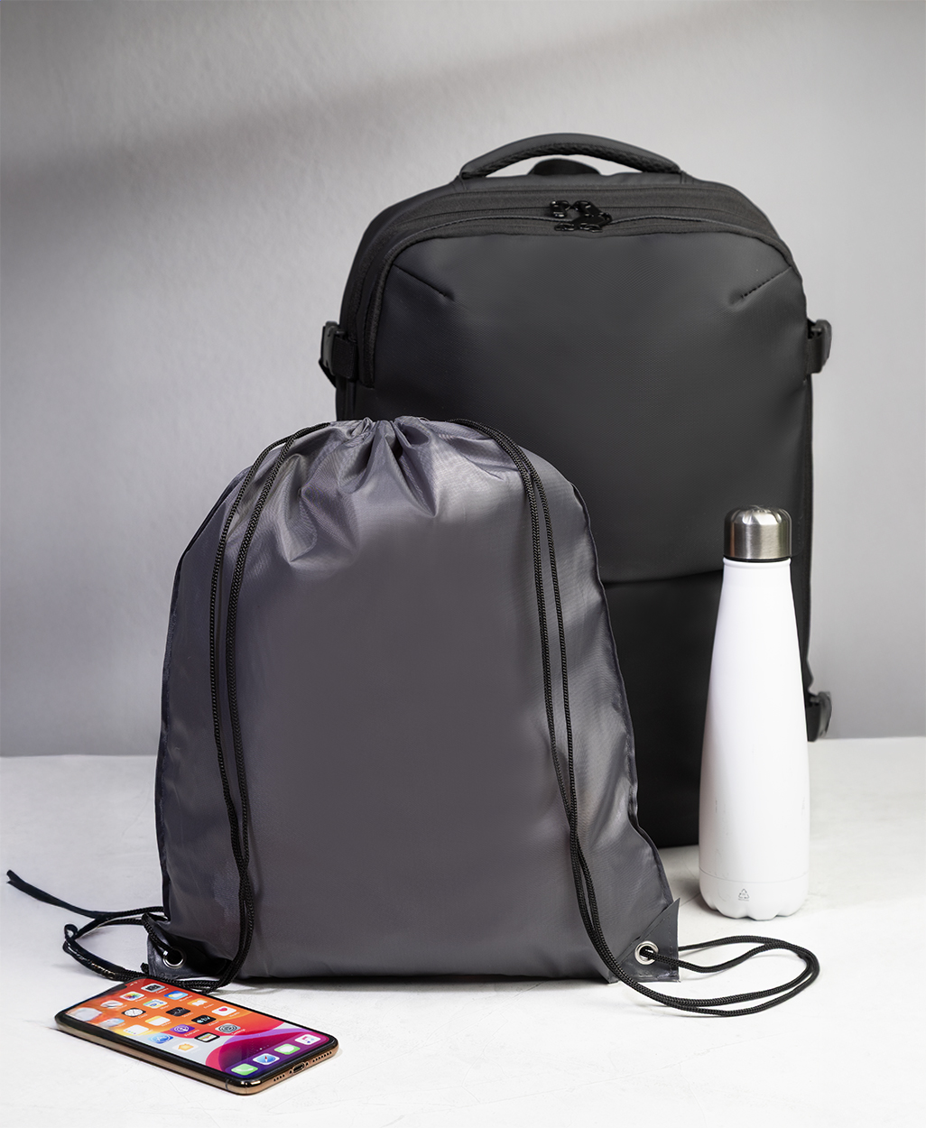 210T polyesterová taška se stahovací šňůrkou se zesílenými rohy z PU kůže.