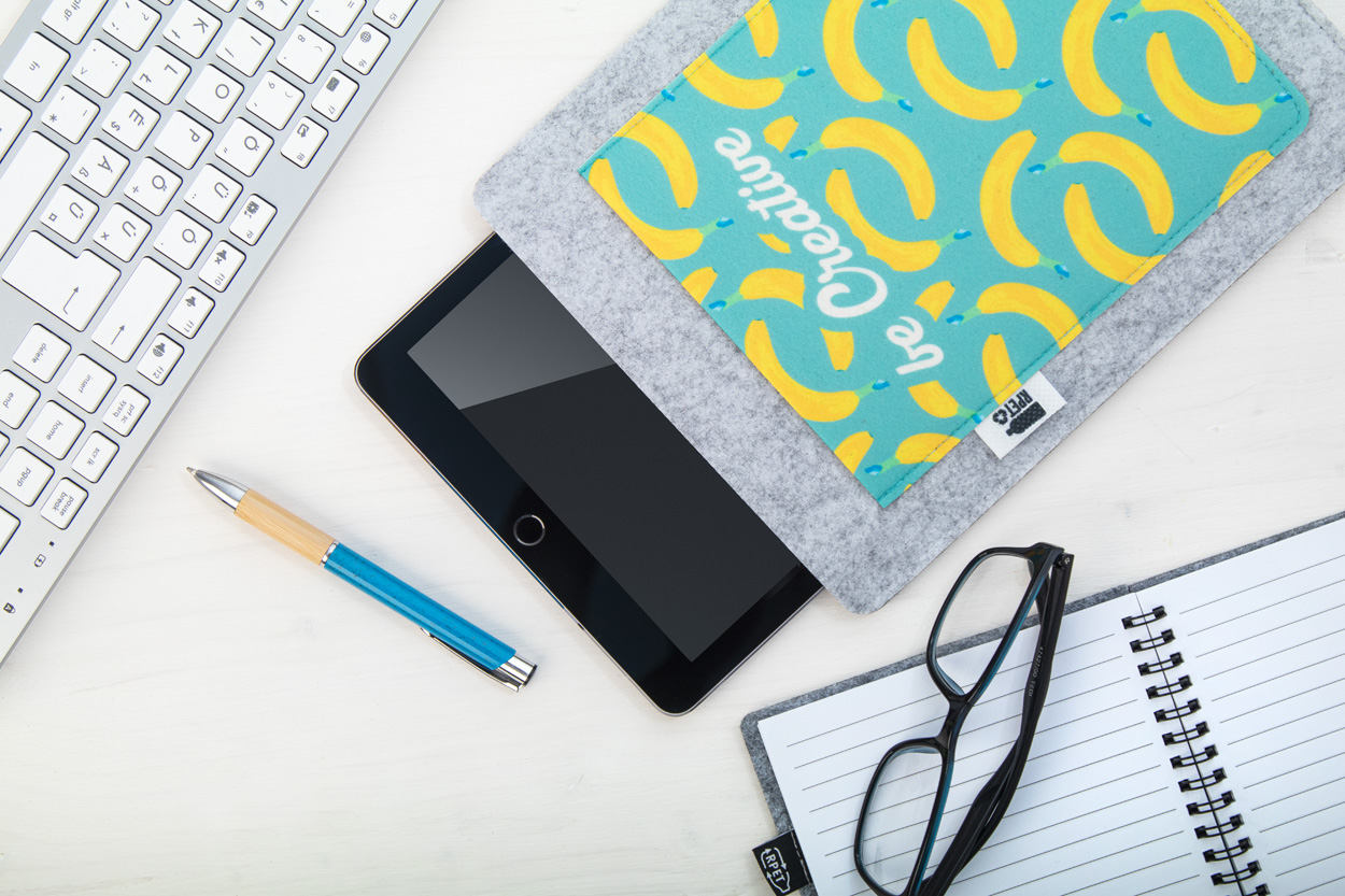 Na zakázku vyrobený plstěný držák na tablet z RPET s celobarevně potištěnou přední kapsou. S výrazným štítkem RPET. Vhodné pro tablety do 11". Cena zahrnuje sublimační potisk. MOQ: 50 ks.