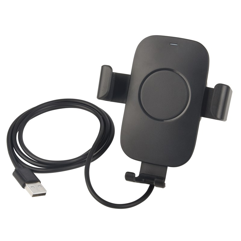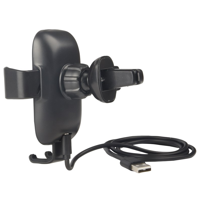 Držák telefonu vhodný pro většinu běžných chytrých telefonů s funkcí indukčního nabíjení, k upevnění na větrací žaluzie automobilu (pro různé tloušťky žaluzií), kulový kloub pro optimální vyrovnání, nabíjecí jednotka s integrovaným kabelem USB (1 m)