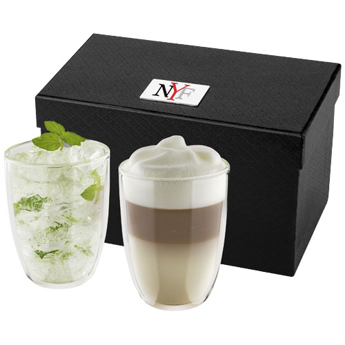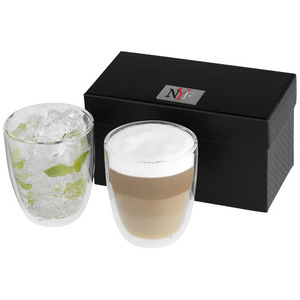 Dvouplášťové skleněné termohrnky, 290ml. Ideální pro podávání vašeho oblíbeného latte macchiato, ledového čaje nebo jakýchkoli teplých či studených nápojů. Dodáváno v luxusní dárkové kazetě. Včetně plakety pro logo.