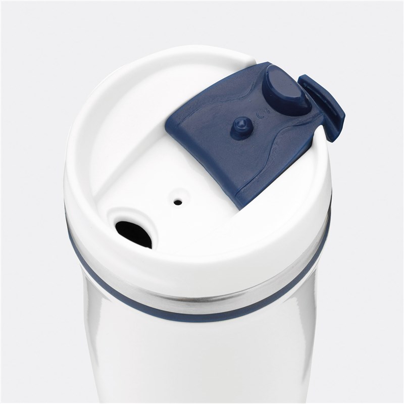 Dvoustěnný cestovní hrnek -nerezová ocel na vnitřní i vnější straně, se šroubovacím plastovým víčkem a integrovaným výklopným otvorem na pití, barevný gumový kroužek kolem horní části a gumové dno, objem cca 400 ml