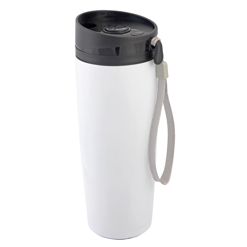 Dvoustěnný cestovní hrnek - vnitřní i vnější strana z nerezové oceli, plastové víčko s bezpečným šroubovacím uzávěrem, tlačítkem OPEN/CLOSE a integrovaným otvorem na pití, gumové dno, objem cca 380 ml, s poutkem na přenášení.