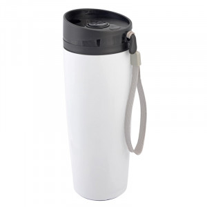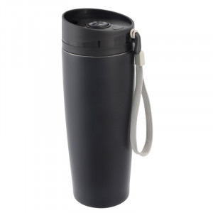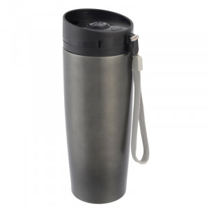 Dvoustěnný cestovní hrnek - vnitřní i vnější strana z nerezové oceli, plastové víčko s bezpečným šroubovacím uzávěrem, tlačítkem OPEN/CLOSE a integrovaným otvorem na pití, gumové dno, objem cca 380 ml, s poutkem na přenášení.