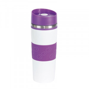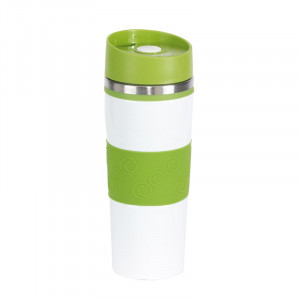 Dvoustěnný cestovní hrnek z nerezové oceli na vnitřní i vnější straně, kontrastní barevné plastové víčko s bezpečným šroubovacím uzávěrem, tlačítko OPEN/CLOSE a integrovaný otvor pro pití, barevná gumová objímka pro lepší uchopení a pogumovaný stojánek pro dobrou přilnavost k povrchu, objem cca 400 ml.
