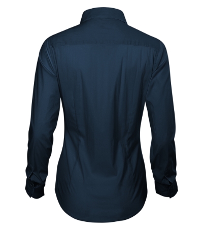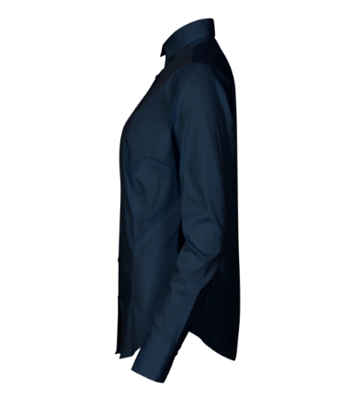 jemný strečový materiál, projmutý střih s bočními švy, dvojité sedlo na zadním dílu, pasové a prsní záševky, dvoudílný košilový límec, přední kraje začištěny légou, dlouhé rukávy s šikmou manžetou na 2 knoflíčky, perleťové knoflíčky v barvě materiálu (1 náhradní navíc), tvarovaný dolní kraj