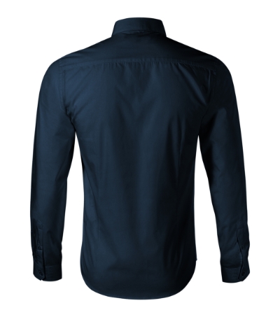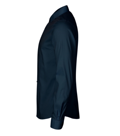 projmutý střih s bočními švy, dvojité sedlo a záševky na zadním dílu, dvoudílný košilový límec, vyztužené špičky límce, přední kraje začištěny légou, dlouhé rukávy s šikmou manžetou na 2 knoflíčky, perleťové knoflíčky v barvě materiálu (1 náhradní navíc), tvarovaný dolní kraj