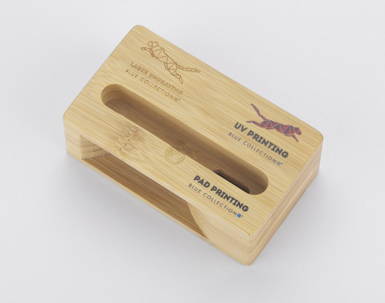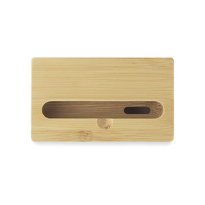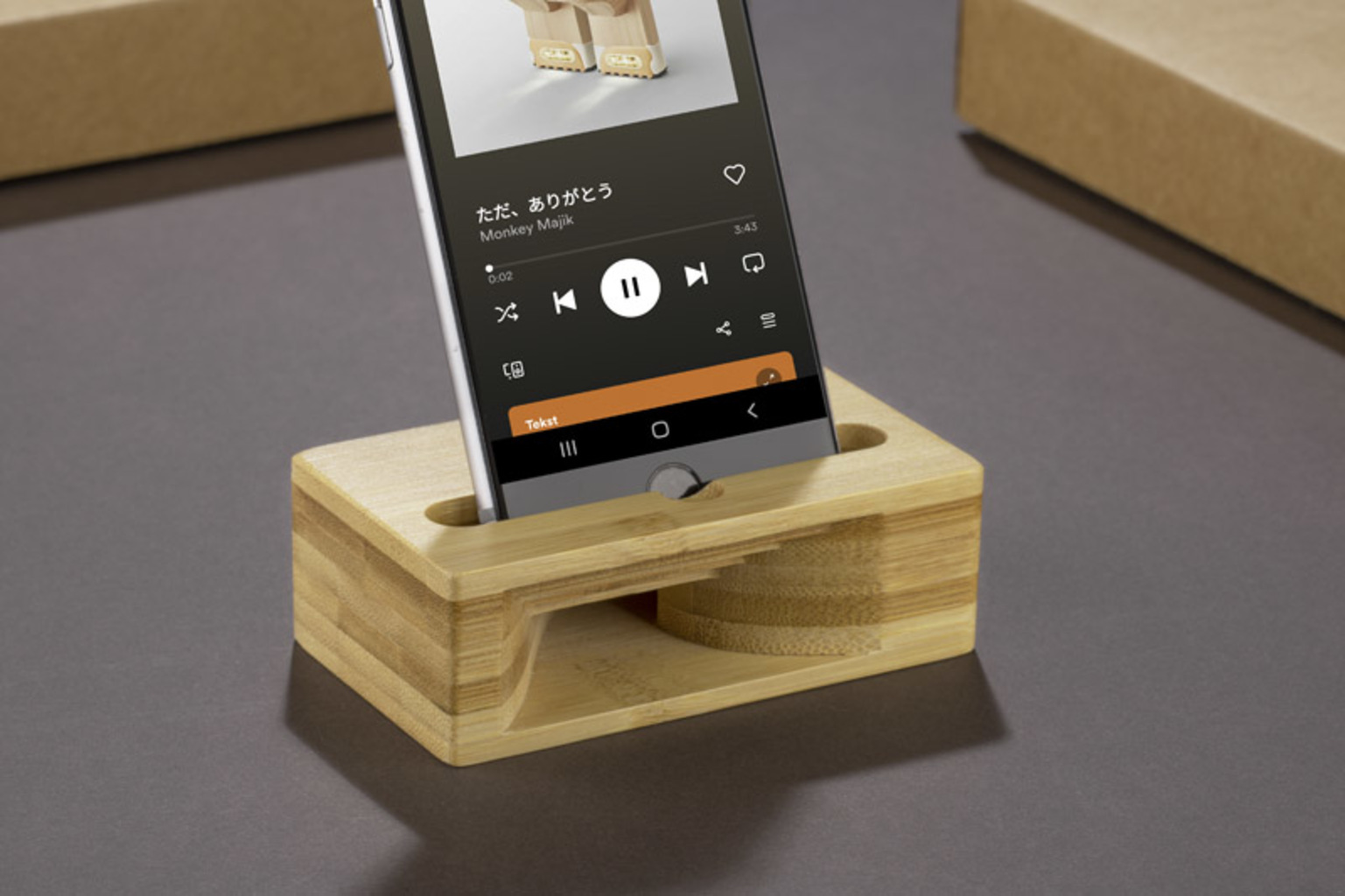 RESONA je bambusový stojánek na telefon, který zároveň slouží jako zesilovač zvuku. Díky jeho tvarování je zvuk vycházející z telefonu, který je umístěný ve stojánku, hlubší a silnější. Stojan je zabalen v hnědé kartonové krabici s infografikou naznačující jeho funkčnost.