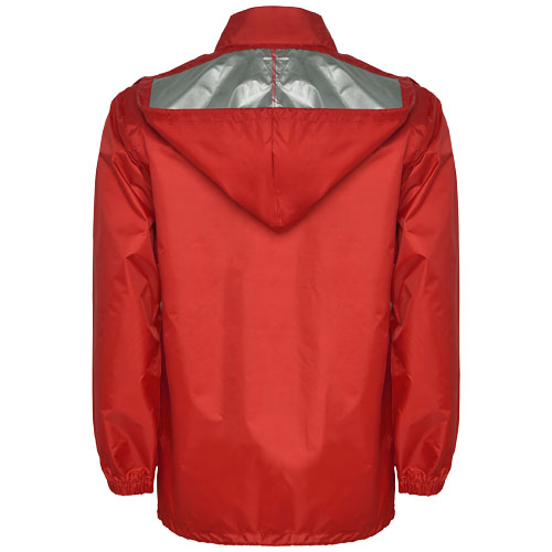 Nepromokavá pláštěnka. Vysoký výstřih a skládací kapuce s nastavitelnou šňůrkou. Přední zip s odpovídajícím taháčkem. Dvě boční kapsy s klopou. Elastické manžety. Elastický pásek uvnitř kapsy pro složení a uskladnění. Voděodolný model. Model měří 185 cm a má na sobě velikost L.