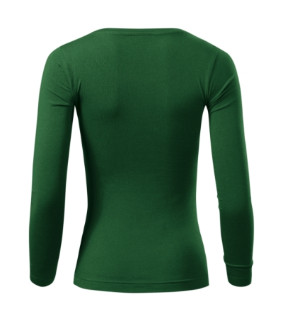 lehce vypasovaný střih s bočními švy, hlubší kulatý výstřih, úzký lem průkrčníku z žebrového úpletu 1:1 s 5 % elastanu, vnitřní část průkrčníku začištěna páskou z vrchového materiálu, zpevnění ramenních švů páskou, dlouhé rukávy
