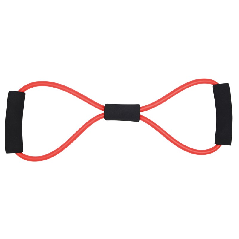 Fitness band pro posílení a tonizaci svalů, elastický cvičební pás s pěnovými rukojeťmi, nylonový sáček s vytahovací šňůrou a plastovou zátkou.