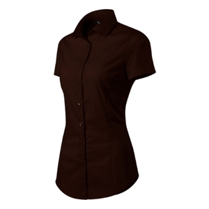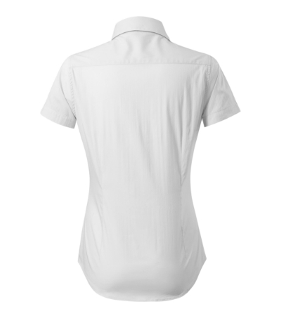 jemný strečový materiál, projmutý střih s bočními švy, dvojité sedlo na zadním dílu, pasové a prsní záševky, dvoudílný košilový límec, přední kraje začištěny légou, perleťové knoflíčky v barvě materiálu (1 náhradní navíc), tvarovaný dolní kraj