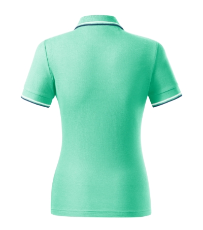lehce vypasovaný střih s bočními švy, límeček z žebrového úpletu 1:1, 2 kontrastní proužky na rukávu a límečku , úzká léga s 4 knoflíčky v barvě materiálu, spodní knoflíček přišitý kontrastní nití, vnitřní průkrčník začištěn kontrastní páskou, zpevnění ramenních švů páskou, rozparky v bočních švech s kontrastní páskou