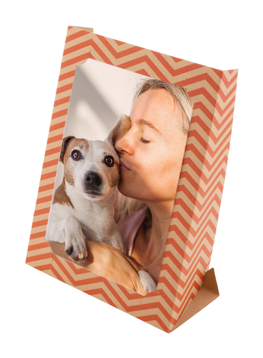 Papírový fotorámeček z kraftového papíru na zakázku pro fotografie 10×15 cm. Cena včetně plnobarevného potisku na přední straně, nezahrnuje tiskovou přípravu. Min. mn.: 100 ks.