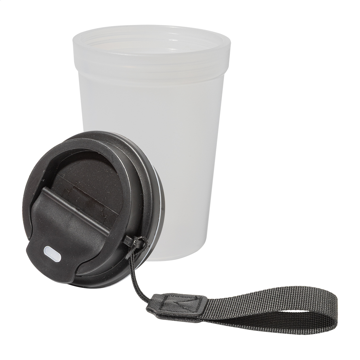 Jednostěnný cestovní kelímek z PP plastu s matnou povrchovou úpravou, víčkem na pití a poutkem z RPET polyesteru. 400 ml.