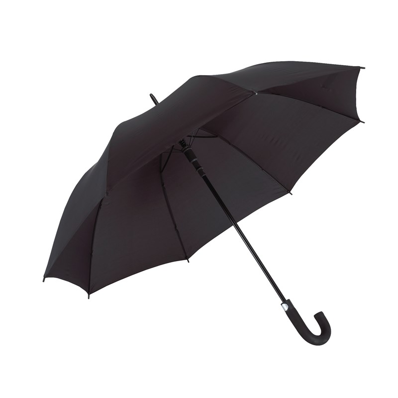 Automatický golfový deštník s černou kovovou tyčí, žebry a špičkami, černá rukojeť z EVA s knoflíkem ve stříbrné barvě, polyesterová stříška se speciální voděodolnou vrstvou, zapínání na suchý zip.