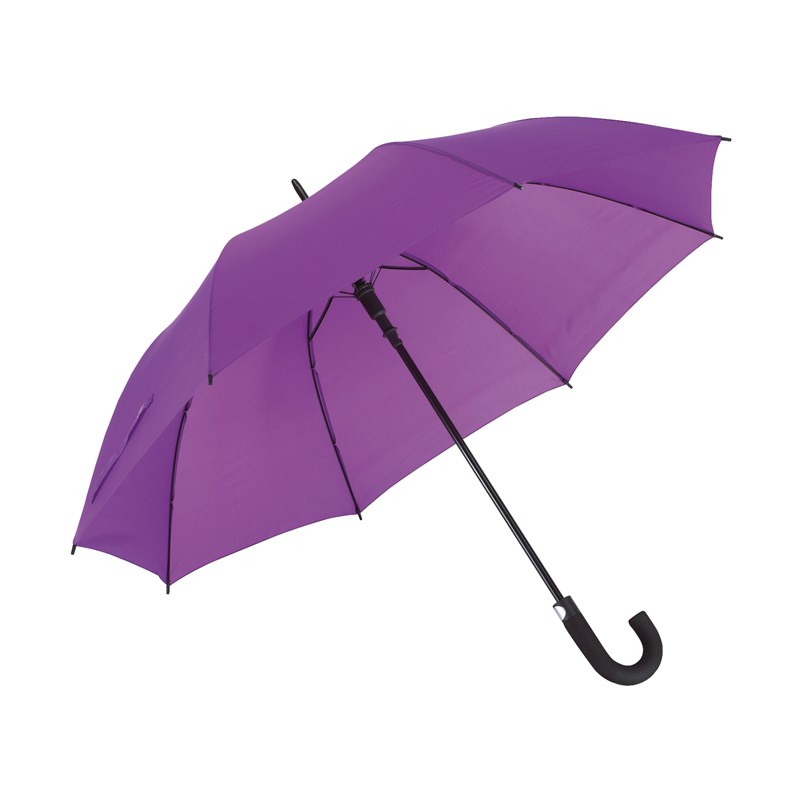 Automatický golfový deštník s černou kovovou tyčí, žebry a špičkami, černá rukojeť z EVA s knoflíkem ve stříbrné barvě, polyesterová stříška se speciální voděodolnou vrstvou, zapínání na suchý zip.