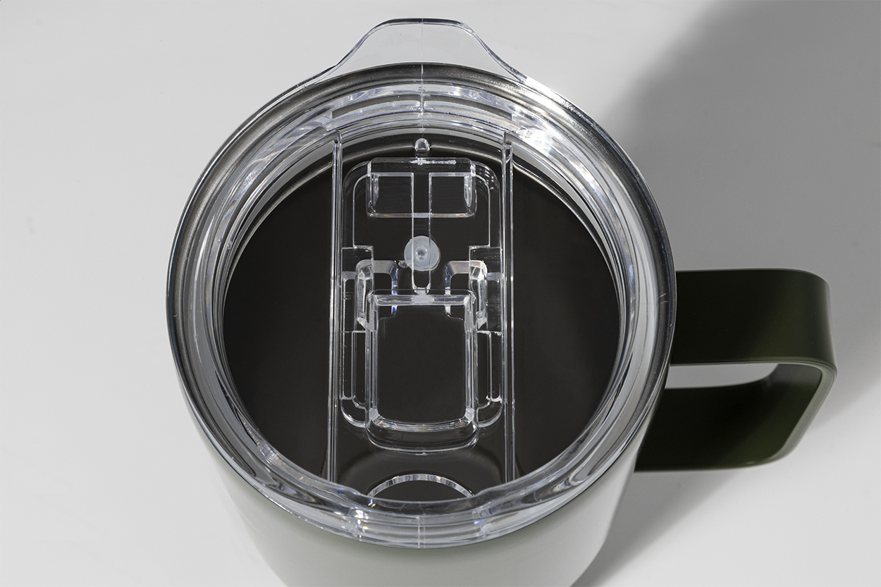 Dvoustěnný vakuově izolovaný termo hrnek z recyklované nerezové oceli s plastovým víčkem na pití z PS. 600 ml.