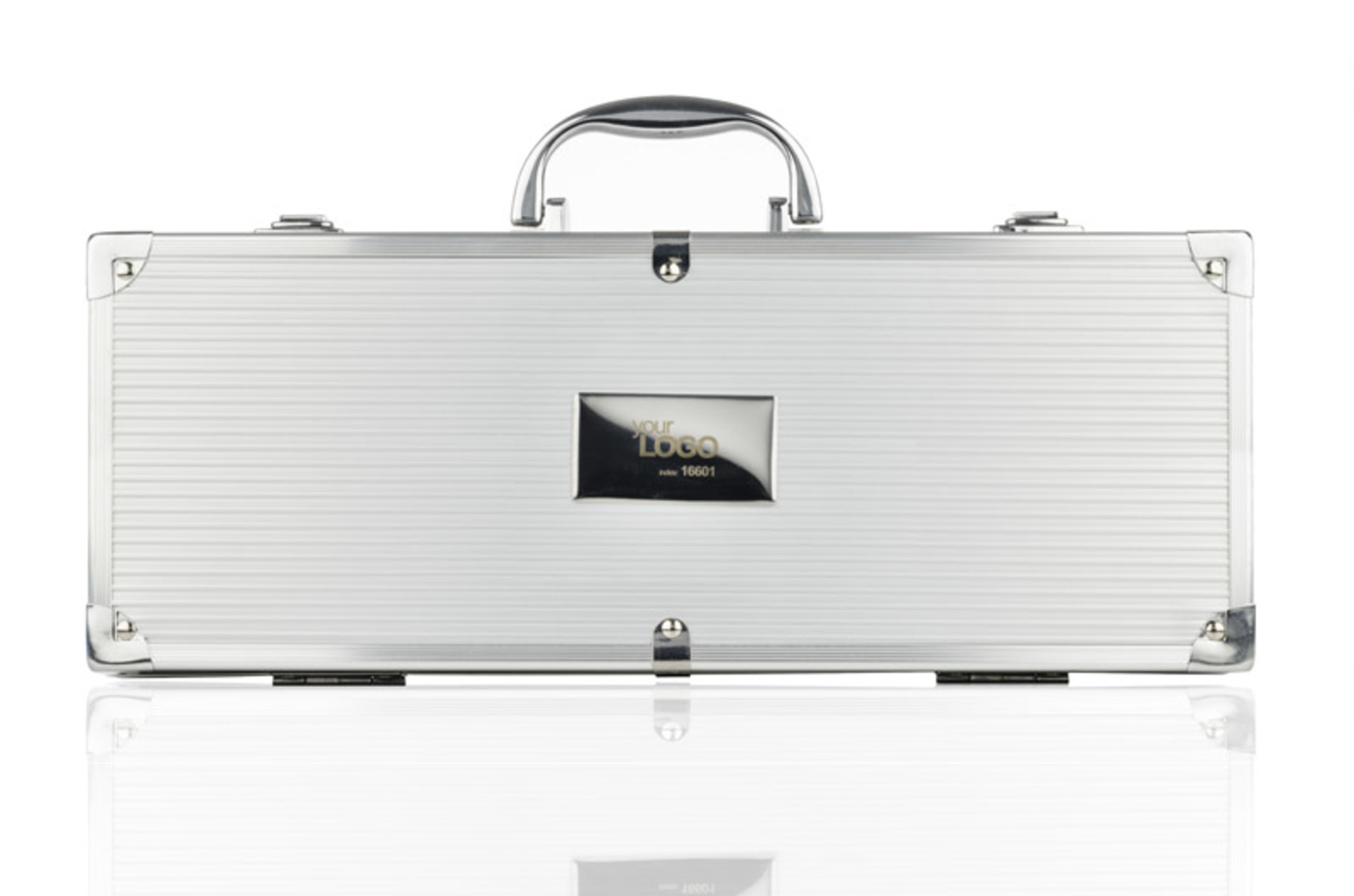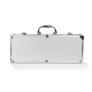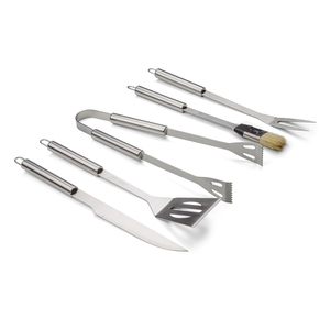Sada na grilování v případě: kleště, špachtla, nůž, vidlička a kartáč. Talíř je připojen samostatně.