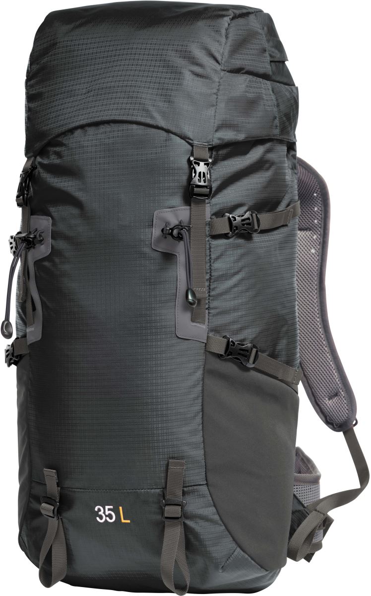 Lehký, funkční batoh s ergonomicky tvarovanými zády, polstrovaný bederní pás, rukojeť, odvětrávací nosný systém, který lze nastavit nahoře i dole, 2 boční kapsy, oddělená komora na dně s ochranou proti dešti, velká hlavní přihrádka s plochou zasouvací kapsou uvnitř, funkční batoh s ergonomicky tvarovanými zády, boční upínací popruhy, dodatečný upevňovací popruh pod poklopem, poklop s přezkami a 2 kapsami na zip, poutko na suchý zip pro fixaci, fixace turistických holí, boční výstupy (vhodné pro sluchátka nebo hadičku systému na piti), objem 35l, rozměry: 29x66x21cm