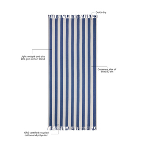 Plážová osuška hamam má klasický dvoubarevný pruhovaný vzor s třásněmi. Je vyrobena z lehké a vzdušné směsi o gramáži 200 g/m2 a kombinuje pohodlí bavlny s rychleschnoucími vlastnostmi polyesteru. Rozměry 80x180 cm jsou ideální na pláž nebo k bazénu. Certifikát GRS zaručuje, že celý dodavatelský řetězec recyklovaných materiálů je certifikován. Celkový obsah recyklovaného materiálu se odvíjí od celkové hmotnosti výrobku. Tento výrobek obsahuje 69 % recyklované bavlny s certifikací GRS a 29 % recyklovaného polyesteru s certifikací GRS.