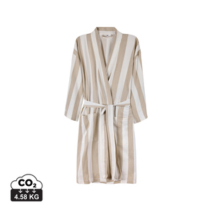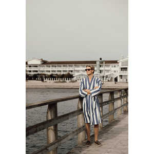Vezměte si tento měkký a pohodlný župan hamam na pláž nebo si ho jednoduše užijte doma. Je vyroben z lehké a vzdušné směsi o gramáži 200 g/m2 a kombinuje pohodlí bavlny s rychleschnoucími vlastnostmi polyesteru. Je navržen s dvoubarevným pruhovaným vzorem, má elegantní límec, přední kapsy, 3/4 rukávy a pásek v pase pro dokonalé přizpůsobení. Certifikace GRS zaručuje, že celý dodavatelský řetězec recyklovaných materiálů je certifikován. Celkový obsah recyklovaných materiálů vychází z celkové hmotnosti výrobku. Tento výrobek obsahuje 69 % recyklované bavlny s certifikací GRS a 29 % recyklovaného polyesteru s certifikací GRS.