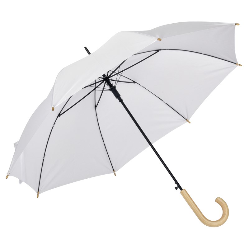 Automatický holový deštník s kovovou tyčí, žebry ze skelných vláken, dřevěnými hroty a dřevěnou rukojetí typu crook, z polyesterového ponže vyrobeného z recyklovaných plastů, zapínání na suchý zip.
