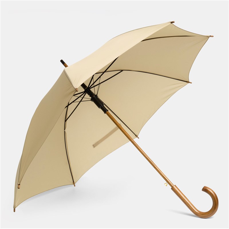 Automatický deštník s dřevěnou tyčí, kovovými žebry, dřevěnými hroty a dřevěnou křivou rukojetí s nylonovou stříškou, zapínání na suchý zip.