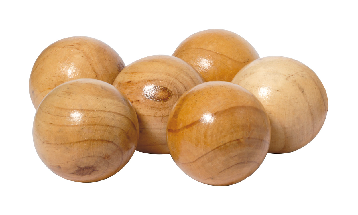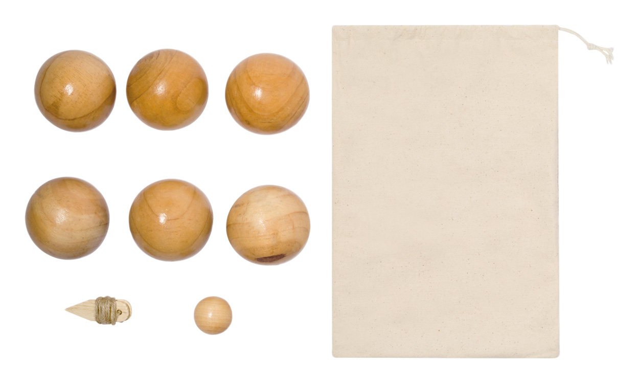 Dřevěná herní sada na petanque se 6 míčky. V bavlněném sáčku se stahovací šňůrkou.