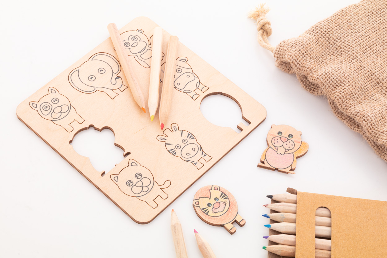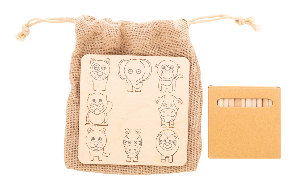 Vybarvovací hra z březové překližky s jutovým pouzdrem. Obsahuje tématické vyřezávané figurky (8 ks) a dřevěné barevné tužky (12 ks) v papírové krabičce.