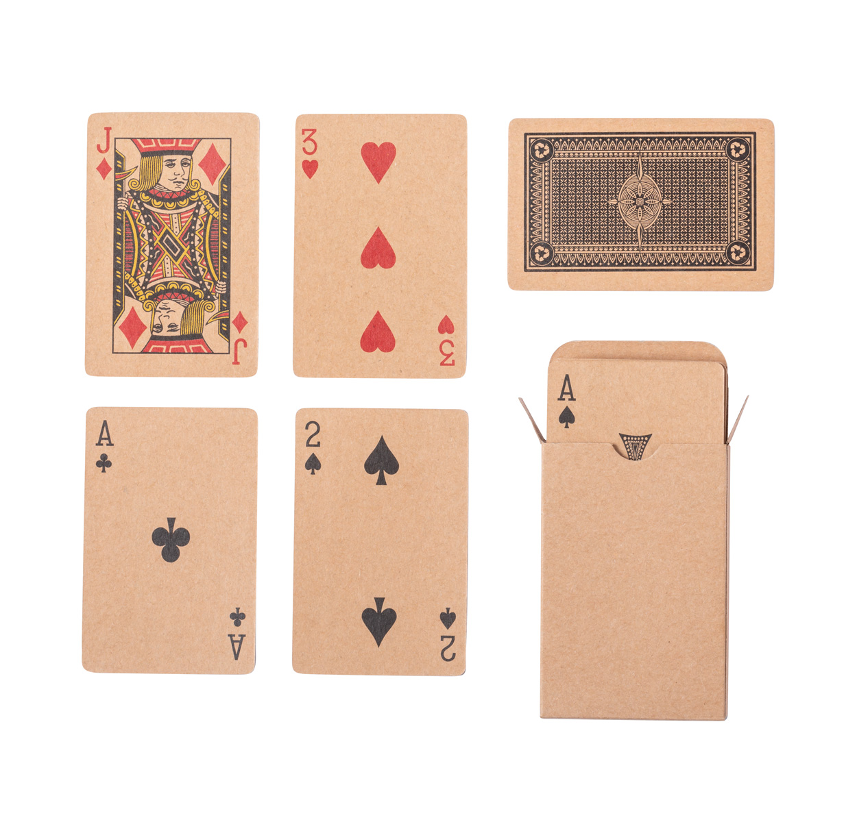 Francouzské hrací karty z recyklovaného papíru v kraftové papírové krabičce. Jeden standardní balíček s 54 kartami.
