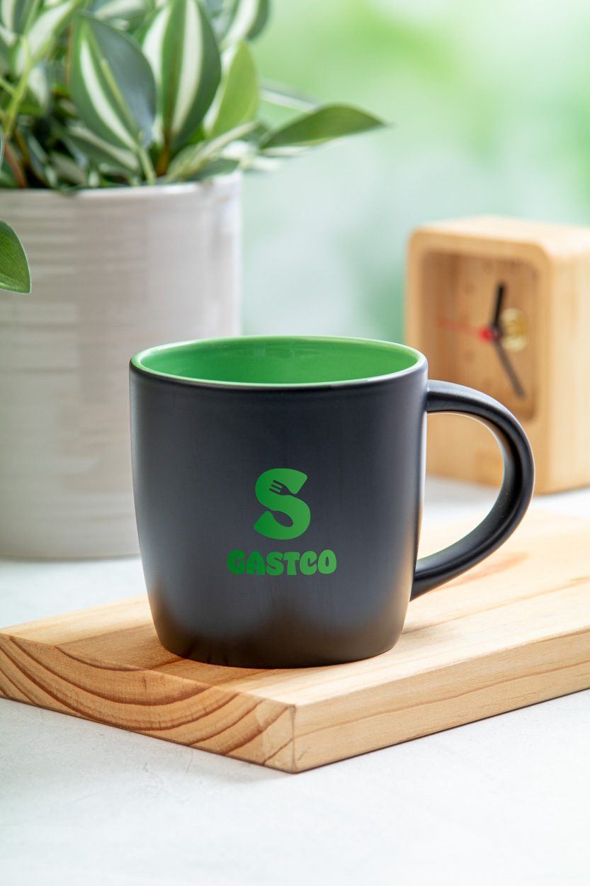 Černý keramický hrnek s barevným vnitřkem, 300 ml. Se speciální vrstvou pro gravírování, gravírované logo ladí s vnitřní barvou. V kraftové papírové krabici.
