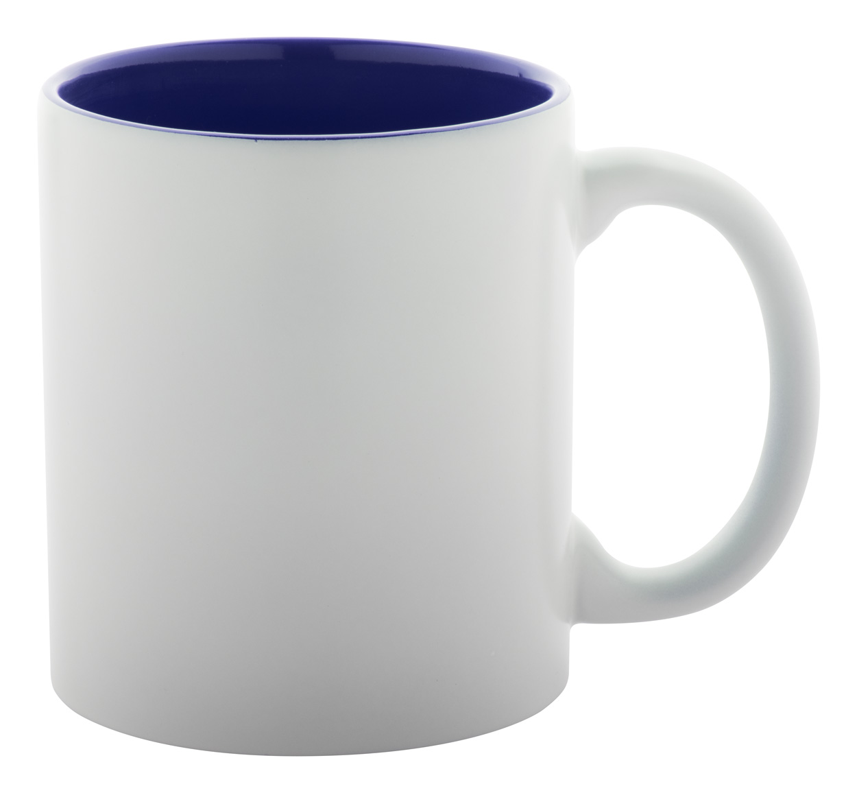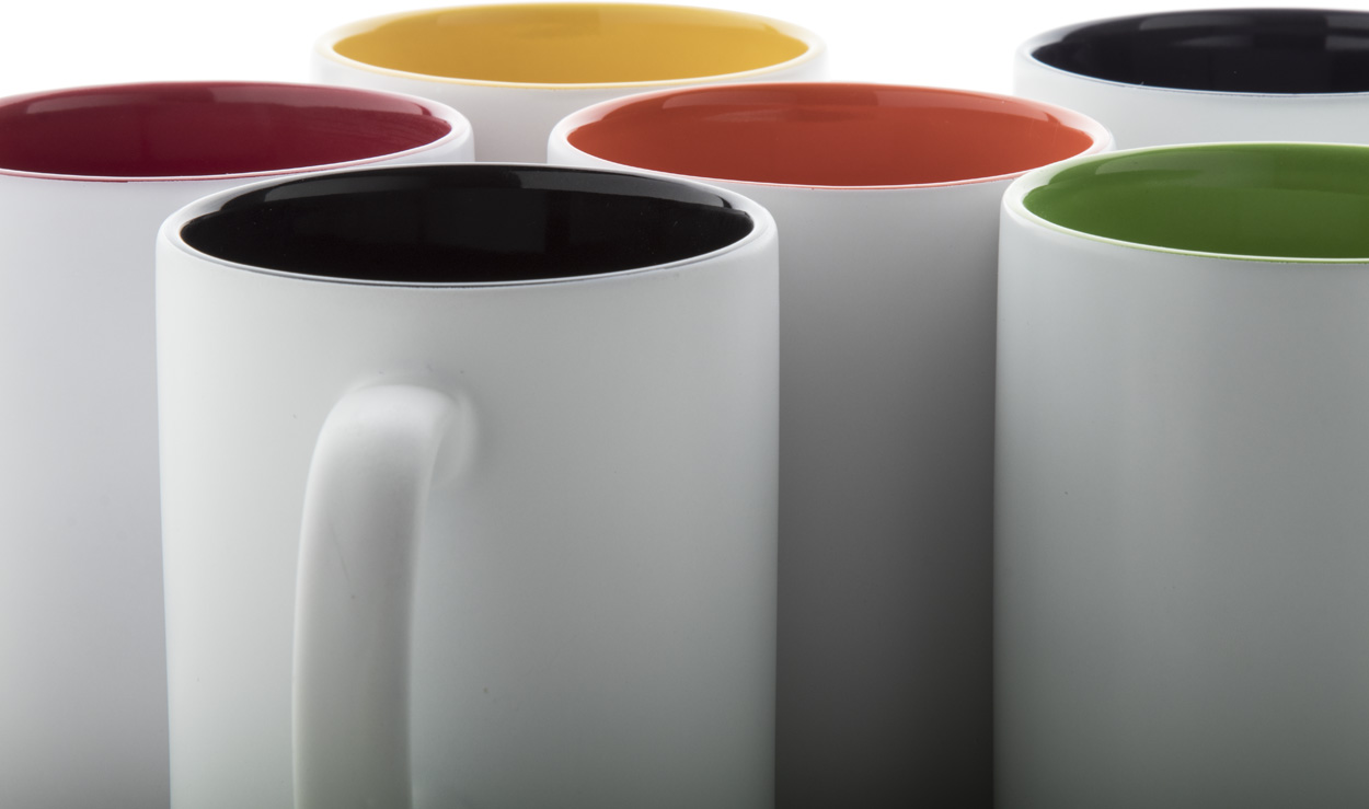 Bílý keramický hrnek, barevný uvnitř, 350 ml. Vygravírované logo je do barvy vnitřku. V dárkové krabičce.