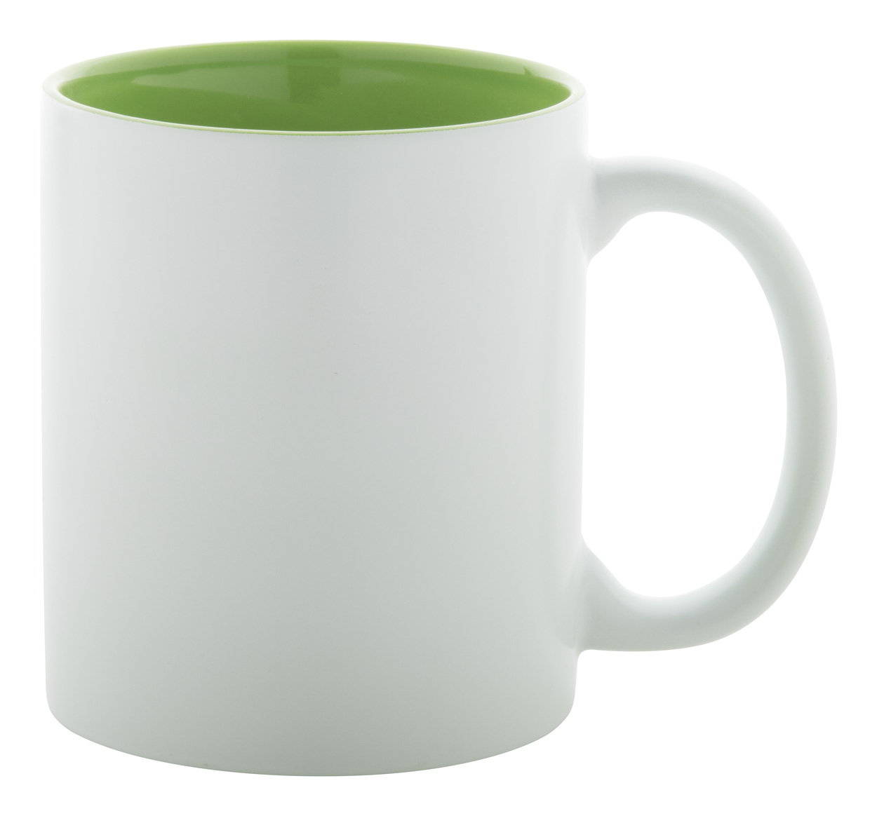 Bílý keramický hrnek, barevný uvnitř, 350 ml. Vygravírované logo je do barvy vnitřku. V dárkové krabičce.