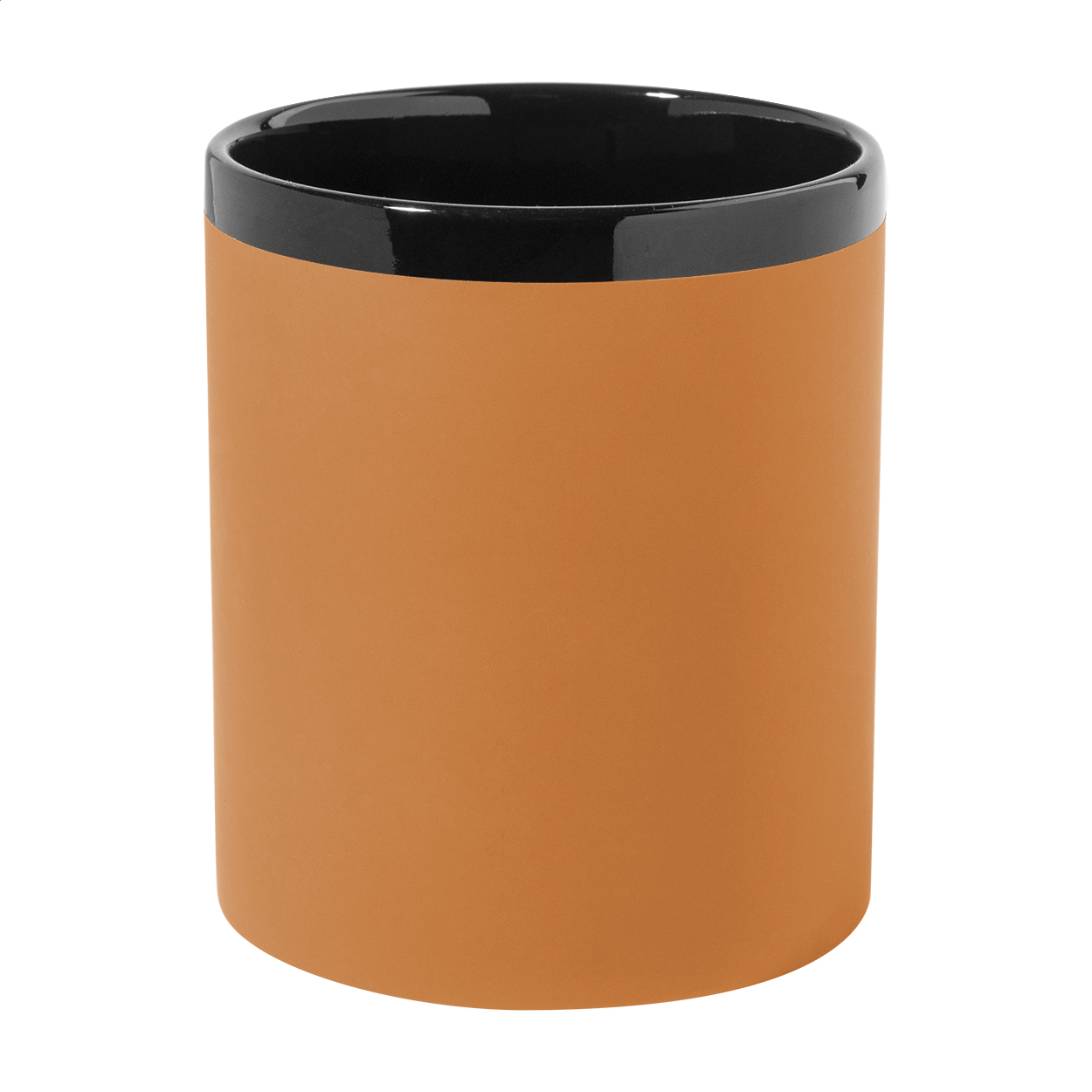 Keramický hrnek s měkkým pogumovaným povrchem a černým vnitřkem a okrajem, 300 ml. Se speciálním povrchem pro gravírování, gravírované logo ladí s barvou na vnitřní straně. V krabičce z kraftového papíru.