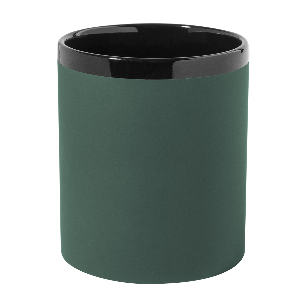Keramický hrnek s měkkým pogumovaným povrchem a černým vnitřkem a okrajem, 300 ml. Se speciálním povrchem pro gravírování, gravírované logo ladí s barvou na vnitřní straně. V krabičce z kraftového papíru.