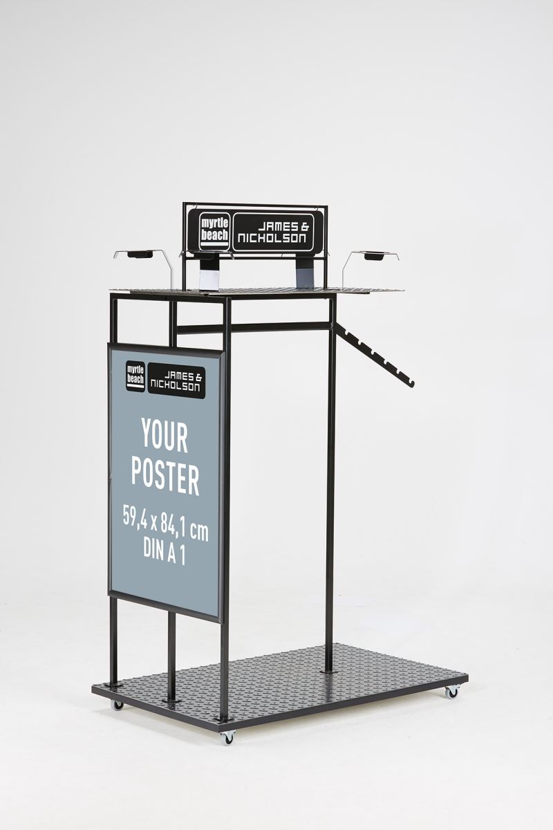 4 kolečka, horní 2-stranný štít s oběma značkami, boční šikmé vysouvání, klasická tyč pro zavěšení zboží, zaklapávací rám pro plakáty vel. DIN A1, včetně 4 držáků na kšiltovky, stojan na katalogy z plastu, rozměry: 115x70x155cm, pratelné na 30°, nelze žehlit, nelze sušit v sušičce, bez možnosti výměny a vrácení, není skladem, podrobné informace o dodacím termínu a skladových zásobách obdržíte po objednání
